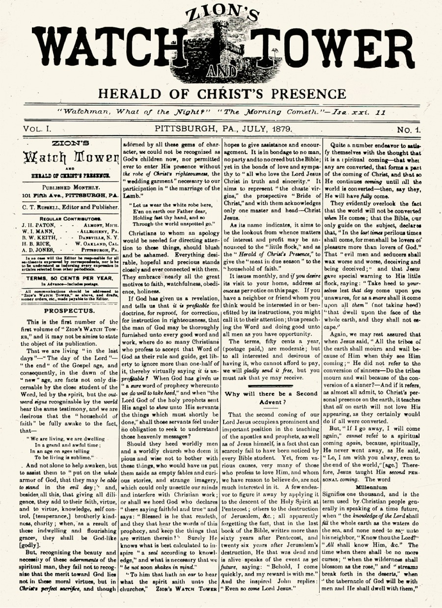 En juillet 1879, sous l'égide du pasteur Russell, est publié le premier numéro de la "Zion’s Watch Tower
